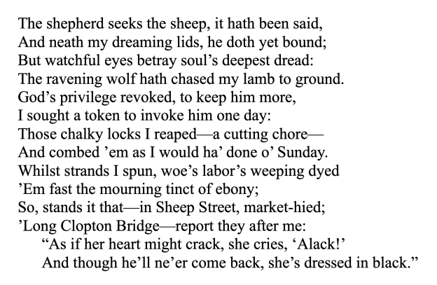 Today, I am sharing a sonnet that might have been penned by Anne Hathaway, William Shakespeare’s wife of thirty-three years, upon the death of her husband. It follows the sonnet form that was popularized, though not invented, by the writer of Shakespeare’s works—but I have leveled up the difficulty a bit. (I’m a bookish kind of daredevil.) Here’s the rhyme scheme of the traditional Shakespearean sonnet: